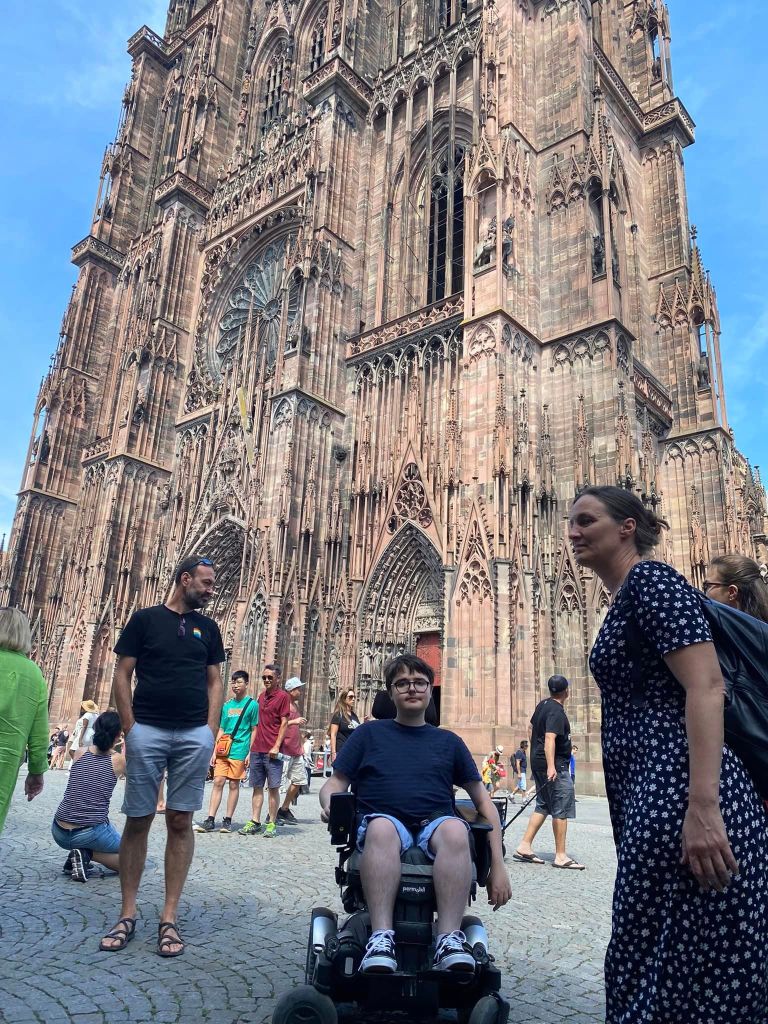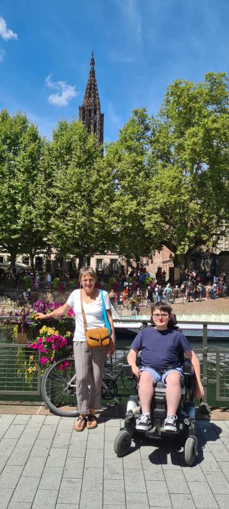 Tous les étés ou presque, nous passons une semaine de vacances au moins entourés d’amis, membres de l’association, qui connaissent bien Hippolyte et ses besoins : maison adaptée, balades accessibles, visites variées, (Hippolyte aime les musées et la culture) et bien entendu apéros et repas à la hauteur… Cette semaine-là, tout le monde s’adapte pour qu’Hippolyte profite. Ce sont des moments précieux pour Hippolyte et moi. Les amis sont capables de transférer Hippolyte si besoin, de l’emmener se baigner, de choisir des itinéraires qui conviennent à tous. En Alsace, nous avons visité Strasbourg, nous sommes montés au Mont Sainte-Odile, nous avons fait du vélo dans la campagne, etc.